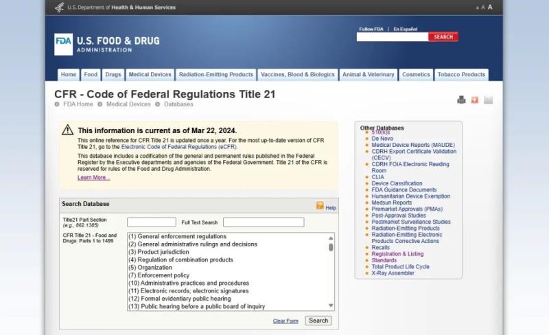 該數(shù)據(jù)庫(kù)能夠提供FDA監(jiān)管范圍內(nèi)產(chǎn)品相關(guān)的所有法規(guī)在線瀏覽,醫(yī)療器械相關(guān)的法規(guī)在第800-898章節(jié)(21 CFR part 800-898),用戶(hù)可以隨時(shí)檢索醫(yī)療器械相關(guān)法規(guī)。當(dāng)然,如該頁(yè)內(nèi)容所述,這里的法規(guī)內(nèi)容是一年更新一次的,假如需要獲取最新法規(guī),可跳轉(zhuǎn)至實(shí)時(shí)更新的CFR電子版