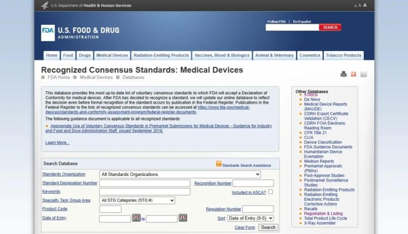 該數(shù)據(jù)庫(kù)包含了所有FDA認(rèn)可的協(xié)調(diào)標(biāo)準(zhǔn),可以通過(guò)標(biāo)準(zhǔn)組織、標(biāo)準(zhǔn)編號(hào)、關(guān)鍵詞等信息進(jìn)行檢索。