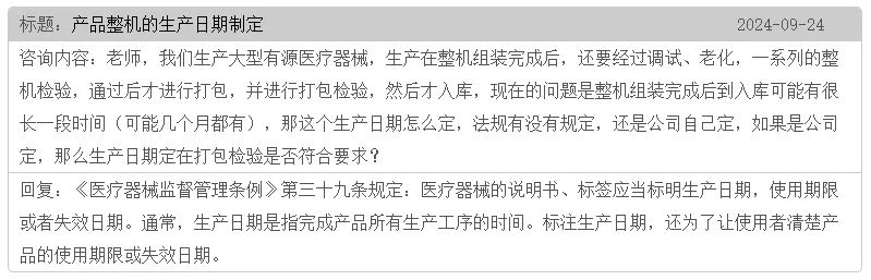 根據(jù)國家藥監(jiān)局食品藥品審核查驗(yàn)中心的答復(fù),《醫(yī)療器械監(jiān)督管理?xiàng)l例》第三十九條規(guī)定:醫(yī)療器械的說明書、標(biāo)簽應(yīng)當(dāng)標(biāo)明生產(chǎn)日期,使用期限或者失效日期。通常,生產(chǎn)日期是指完成產(chǎn)品所有生產(chǎn)工序的時(shí)間。標(biāo)注生產(chǎn)日期,還為了讓使用者清楚產(chǎn)品的使用期限或失效日期。