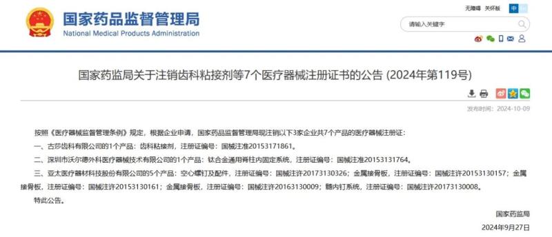 10月9日,國家藥監(jiān)局發(fā)布一則醫(yī)療器械注冊證注銷公告,公告顯示,局已依法注銷古莎齒科有限公司、深圳市沃爾德外科醫(yī)療器械技術(shù)有限公司等3家企業(yè)共計(jì)7個(gè)產(chǎn)品的醫(yī)療器械注冊證,具體如下: