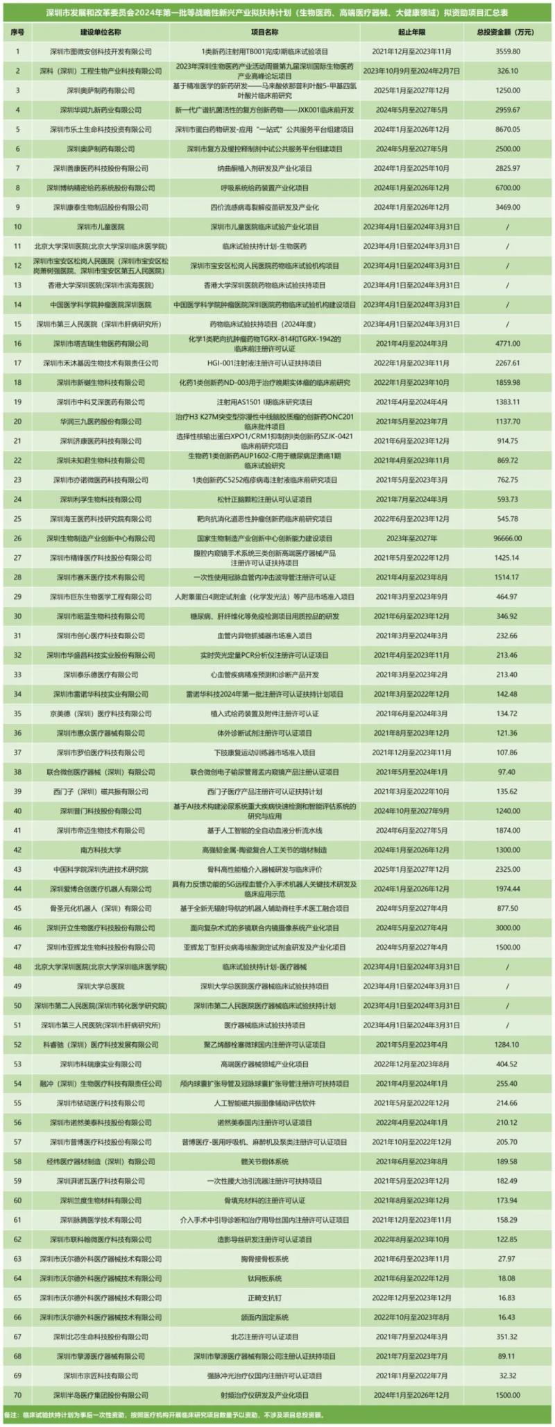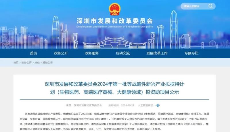 10月21日,深圳市發(fā)展和改革委員會發(fā)布了2024年第一批戰(zhàn)略性新興產(chǎn)業(yè)扶持計劃(生物醫(yī)藥、高端醫(yī)療器械、大健康領(lǐng)域)擬資助項目,公示時間為5個工作日。我們通過查閱附件表格后發(fā)現(xiàn),本批共有70個擬資助項目,包括醫(yī)藥領(lǐng)域臨床前研究、臨床試驗扶持、注冊許可扶持等,總投資金額最高的為96666萬元。深圳發(fā)改委將根據(jù)此前公布的相應(yīng)領(lǐng)域的專項資金項目申報指南,按總投資金額的一定比例對企業(yè)進行補貼。