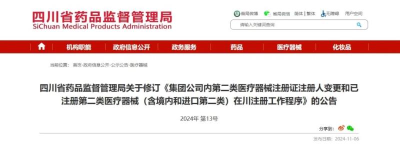近日,四川省藥監(jiān)局發(fā)布了新版《集團(tuán)公司內(nèi)第二類醫(yī)療器械注冊(cè)證注冊(cè)人變更和已注冊(cè)第二類醫(yī)療器械(含境內(nèi)和進(jìn)口第二類)在川注冊(cè)工作程序》,具體內(nèi)容如下: