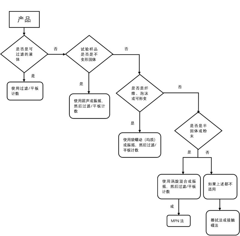 生物負載測定方法學(xué)層面,主要參照ISO 11737-1、GB/T 19973.1和YY/T 1737等標準進行方法開發(fā)和確認。在完成方法確認后,采用經(jīng)確認的方法進行生物負載的常規(guī)測定。在方法開發(fā)時,可采用圖2所示的決策樹進行生物負載測定方法的選擇。在方法確認時,首先應(yīng)參考藥典等文件進行方法適用性試驗;其次,當生物負載測定法包括從產(chǎn)品中采集微生物時,應(yīng)對采集和培養(yǎng)過程的生物負載回收率進行確認。應(yīng)視產(chǎn)品上微生物數(shù)量的情況選擇重復(fù)回收法或者產(chǎn)品接種法進行生物負載回收率確認試驗。