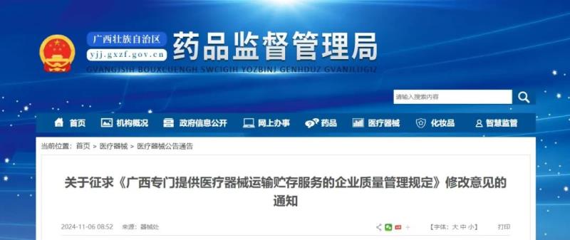 近日,廣西壯族自治區(qū)藥監(jiān)局發(fā)布《廣西專門提供醫(yī)療器械運(yùn)輸貯存服務(wù)的企業(yè)質(zhì)量管理規(guī)定》(以下簡稱《規(guī)定》),并向社會(huì)公開征求意見。