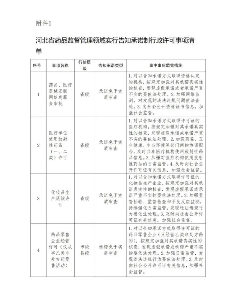 近日,河北省藥監(jiān)局發(fā)布《關于進一步做好行政許可告知承諾制工作的通知》(以下簡稱《通知》),其中提到,藥品、醫(yī)療器械互聯(lián)網信息服務審批、醫(yī)療單位使用放射性藥品(一、二類)許可、化妝品生產延續(xù)許可、藥品零售企業(yè)經營許可(僅從事乙類非處方藥零售活動)等4項行政許可事項(詳見下方圖片)實行告知承諾制,相關監(jiān)管部門需加強審批和監(jiān)管工作。