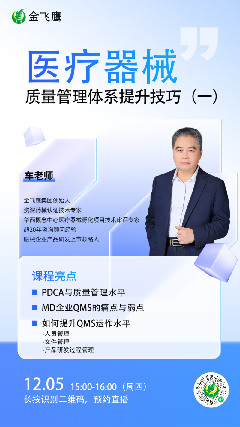 金飛鷹直播培訓(xùn)簡介 金飛鷹直播培訓(xùn),是每周一次的固定培訓(xùn)欄目,優(yōu)選金飛鷹國內(nèi)外資深注冊/項目老師定期為大家講解醫(yī)療器械注冊相關(guān)知識,解答大家在醫(yī)療器械注冊過程中的諸多疑問。 此前我們已為大家?guī)硇掳驷t(yī)療器械生物學評價標準、新版醫(yī)療器械風險管理標準、醫(yī)療器械軟件注冊、新版醫(yī)療器械經(jīng)營質(zhì)量管理規(guī)范等共計105次線上培訓(xùn)課程,有興趣的可點擊視頻號直播回放進行查看~另外大家也一定很關(guān)注接下來的培訓(xùn)主題,相關(guān)培訓(xùn)預(yù)告我們會陸續(xù)添加至視頻號,請大家持續(xù)關(guān)注哦!