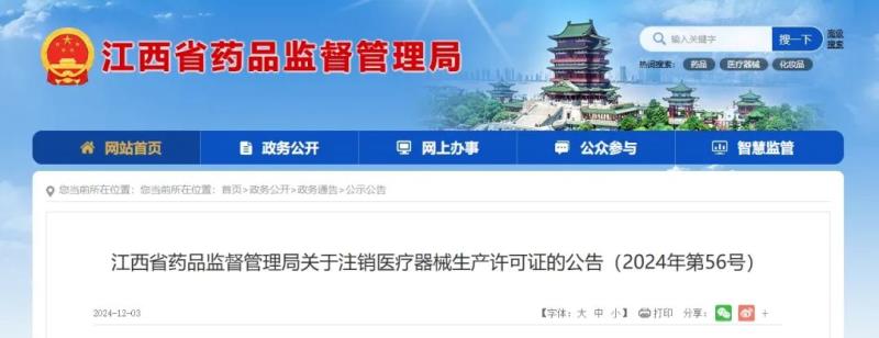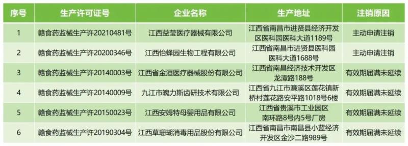 12月3日,江西省藥監(jiān)局發(fā)布公告稱,根據(jù)《中華人民共和國行政許可法》《醫(yī)療器械監(jiān)督管理?xiàng)l例》《醫(yī)療器械生產(chǎn)監(jiān)督管理辦法》規(guī)定,由于企業(yè)主動(dòng)申請(qǐng)注銷或有效期屆滿未延續(xù),該局已依法注銷江西益瑩醫(yī)療器械有限公司、江西怡蜂園生物工程有限公司等6家企業(yè)的《醫(yī)療器械生產(chǎn)許可證》,具體明細(xì)如下: