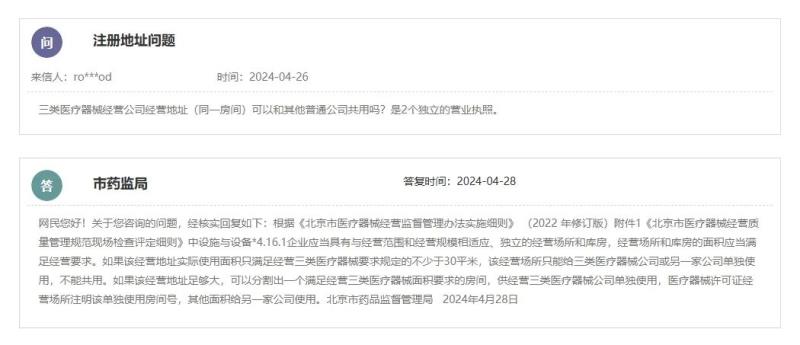 根據(jù)北京市藥監(jiān)局的答復(fù),《北京市醫(yī)療器械經(jīng)營(yíng)監(jiān)督管理辦法實(shí)施細(xì)則》(2022 年修訂版)附件1《北京市醫(yī)療器械經(jīng)營(yíng)質(zhì)量管理規(guī)范現(xiàn)場(chǎng)檢查評(píng)定細(xì)則》,其中“設(shè)施與設(shè)備”章節(jié)4.16.1規(guī)定:“企業(yè)應(yīng)當(dāng)具有與經(jīng)營(yíng)范圍和經(jīng)營(yíng)規(guī)模相適應(yīng)、獨(dú)立的經(jīng)營(yíng)場(chǎng)所和庫(kù)房,經(jīng)營(yíng)場(chǎng)所和庫(kù)房的面積應(yīng)當(dāng)滿足經(jīng)營(yíng)要求。”