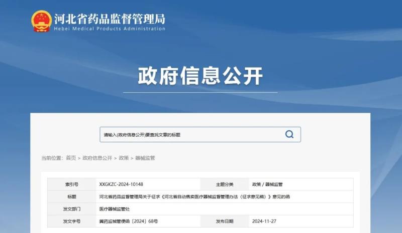 近日,河北省藥監(jiān)局發(fā)布《河北省自動售賣醫(yī)療器械監(jiān)督管理辦法(征求意見稿)》(以下簡稱《辦法》),并向社會公開征求意見。