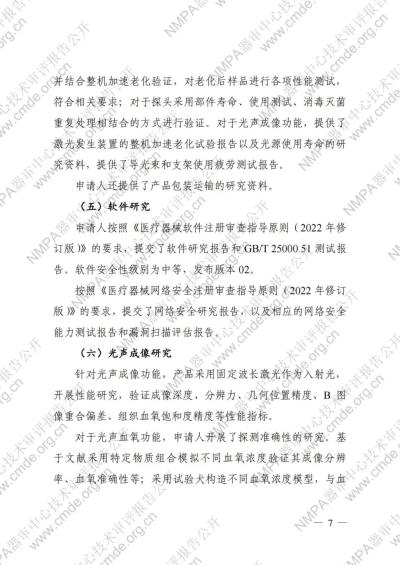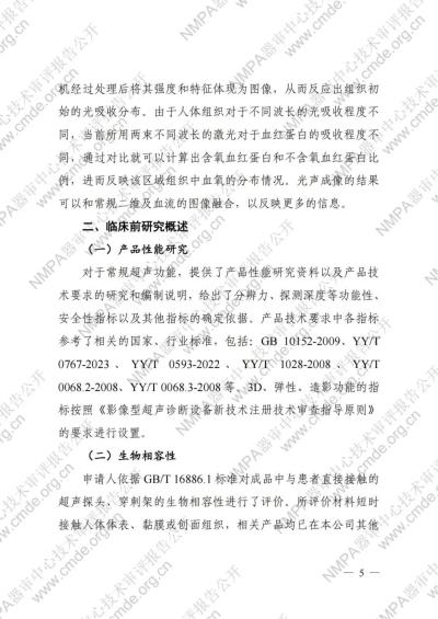 產(chǎn)品利用超聲回波及多普勒等原理,實(shí)現(xiàn)對人體組織的超聲成像。產(chǎn)品具有多種不同的成像模式和后處理功能,不涉及深度學(xué)習(xí)算法??蛇x配不同型號(hào)的探頭以及穿刺架、耦合劑加熱器等不同部件。 除常規(guī)超聲功能外,本產(chǎn)品還具有光聲成像功能,在線陣探頭的基礎(chǔ)上增加同步輸出的近紅外激光,當(dāng)組織被激光照射吸收光的部分能量后產(chǎn)生熱膨脹,并以特定機(jī)械波的形式釋放出去從而產(chǎn)生相應(yīng)頻率的超聲信號(hào),探頭接受該信號(hào)傳輸?shù)街鳈C(jī)經(jīng)過處理后將其強(qiáng)度和特征體現(xiàn)為圖像,從而反應(yīng)出組織初始的光吸收分布。由于人體組織對于不同波長的光吸收程度不同,當(dāng)前所用兩束不同波長的激光對于血紅蛋白的吸收程度不同,通過對比就可以計(jì)算出含氧血紅蛋白和不含氧血紅蛋白比例,進(jìn)而反映該區(qū)域組織中血氧的分布情況。光聲成像的結(jié)果可以和常規(guī)二維及血流的圖像融合,以反映更多的信息。