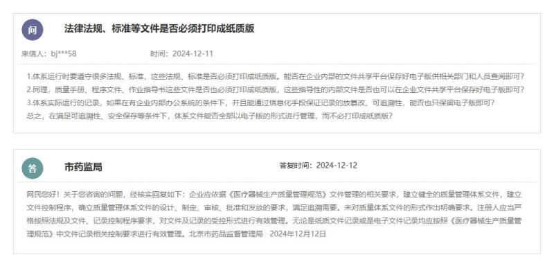 根據(jù)北京市藥監(jiān)局的答復(fù),企業(yè)應(yīng)依據(jù)《醫(yī)療器械生產(chǎn)質(zhì)量管理規(guī)范》文件管理的相關(guān)要求,建立健全的質(zhì)量管理體系文件,建立文件控制程序,確立質(zhì)量管理體系文件的設(shè)計、制定、審核、批準和發(fā)放的要求,滿足追溯需要。未對質(zhì)量體系文件的形式作出明確要求。注冊人應(yīng)當嚴格按照法規(guī)及文件、記錄控制程序要求,對文件及記錄的受控形式進行有效管理。無論是紙質(zhì)文件記錄或是電子文件記錄,均應(yīng)按照《醫(yī)療器械生產(chǎn)質(zhì)量管理規(guī)范》中文件記錄相關(guān)控制要求進行有效管理。