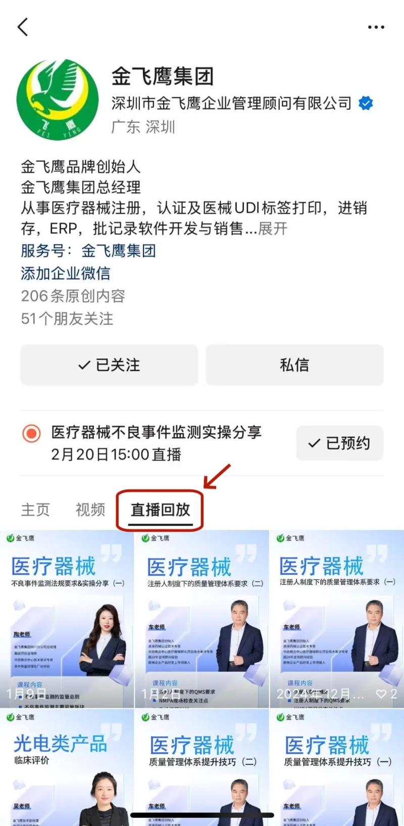 往期直播培訓課程支持回放,關注“金飛鷹藥械咨詢服務”視頻號并點擊視頻號主頁,即可查看“直播回放”哦~