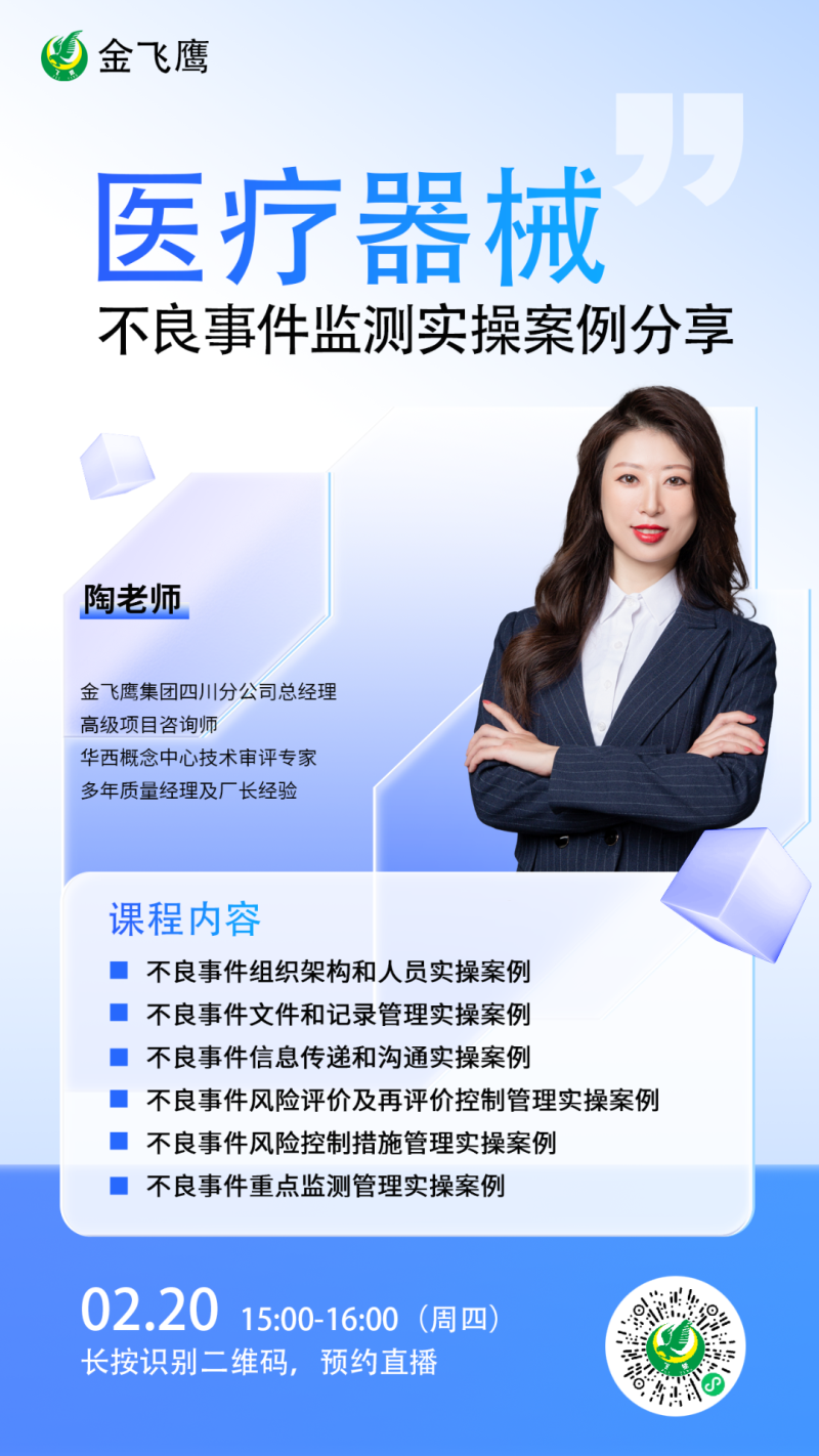 金飛鷹直播培訓簡介 金飛鷹直播培訓,是每周一次的固定培訓欄目,優(yōu)選金飛鷹國內(nèi)外資深注冊/項目老師定期為大家講解醫(yī)療器械注冊相關知識,解答大家在醫(yī)療器械注冊過程中的諸多疑問。 此前我們已為大家?guī)硇掳驷t(yī)療器械生物學評價標準、新版醫(yī)療器械風險管理標準、醫(yī)療器械軟件注冊、醫(yī)療器械質(zhì)量管理體系提升技巧等共計111次線上培訓課程,有興趣的可點擊視頻號直播回放進行查看~另外大家也一定很關注接下來的培訓主題,相關培訓預告我們會陸續(xù)添加至視頻號,請大家持續(xù)關注哦!
