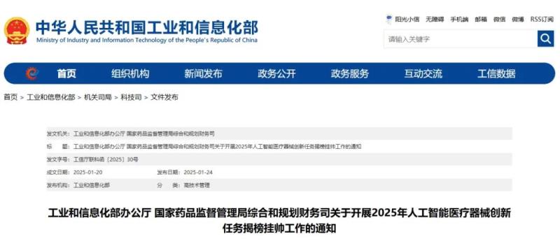 日前,工業(yè)和信息化部辦公廳、國家藥品監(jiān)督管理局綜合和規(guī)劃財務(wù)司聯(lián)合印發(fā)《關(guān)于開展2025年人工智能醫(yī)療器械創(chuàng)新任務(wù)揭榜掛帥工作的通知》(工信廳聯(lián)科函〔2025〕30號)(以下簡稱《通知》),推動人工智能技術(shù)與醫(yī)療器械深度融合發(fā)展,更好地服務(wù)和保障人民群眾生命健康,加快形成新質(zhì)生產(chǎn)力。