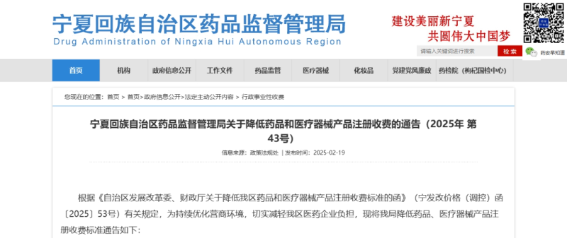 2月19日,寧夏回族自治區(qū)藥監(jiān)局發(fā)布《關于降低藥品和醫(yī)療器械產(chǎn)品注冊收費的通告(2025年 第43號)》,大幅降低藥品和醫(yī)療器械產(chǎn)品注冊收費標準。具體內(nèi)容如下: