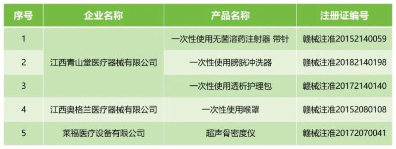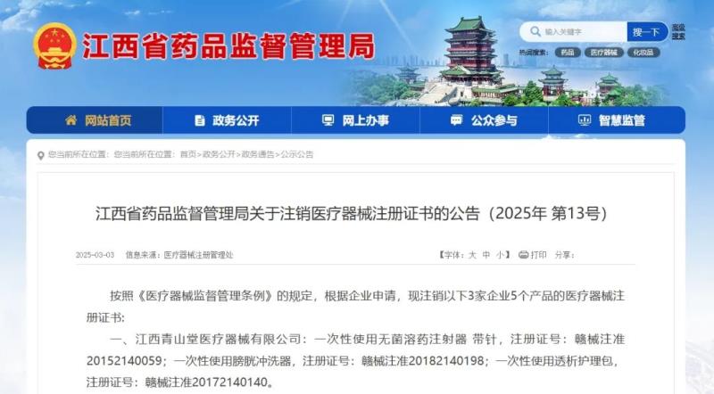 3月3日,江西省藥監(jiān)局發(fā)布通告稱,按照《醫(yī)療器械監(jiān)督管理?xiàng)l例》的規(guī)定,根據(jù)企業(yè)申請(qǐng),該局已注銷江西青山堂醫(yī)療器械有限公司、江西奧格蘭醫(yī)療器械有限公司等3家企業(yè)共計(jì)5個(gè)產(chǎn)品的醫(yī)療器械注冊(cè)證書(shū),具體明細(xì)如下: