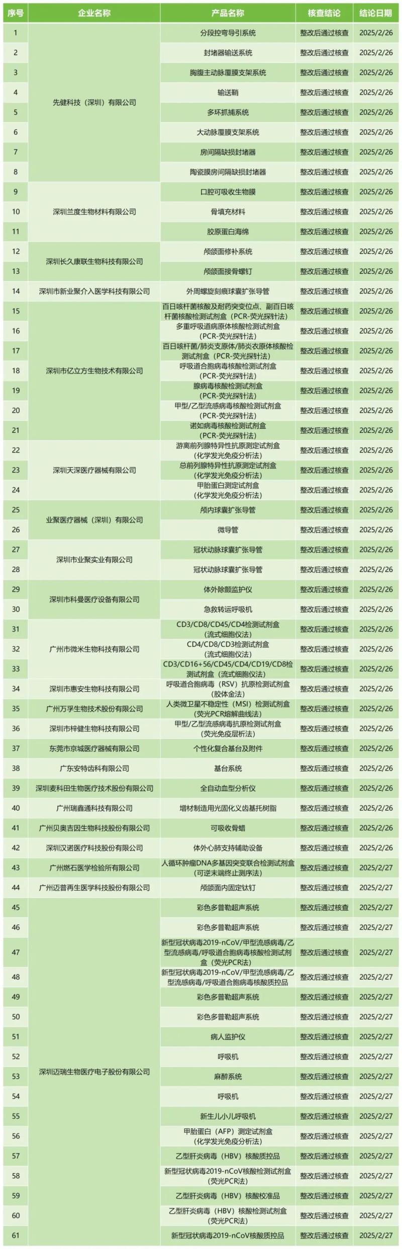 3月13日,廣東省藥監(jiān)局官網(wǎng)公布2025年2月醫(yī)療器械注冊質(zhì)量管理體系核查結(jié)果,包括深圳蘭度生物材料有限公司的膠原蛋白海綿、深圳市科曼醫(yī)療設(shè)備有限公司的體外除顫監(jiān)護(hù)儀、廣州瑞鑫通科技有限公司的增材制造用光固化義齒基托樹脂、深圳邁瑞生物醫(yī)療電子股份有限公司的彩色多普勒超聲系統(tǒng)等共計61款產(chǎn)品,均為“整改后通過核查”。具體明細(xì)見下方表格: