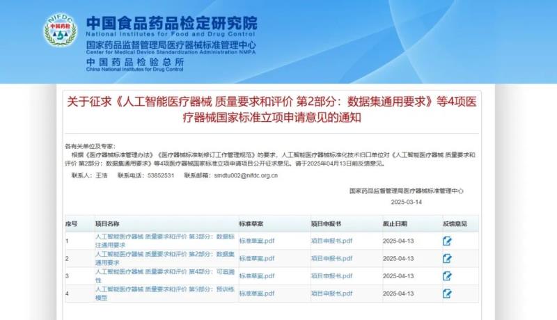 3月14日,國(guó)家藥監(jiān)局醫(yī)療器械標(biāo)準(zhǔn)管理中心發(fā)布《人工智能醫(yī)療器械 質(zhì)量要求和評(píng)價(jià) 第1部分:術(shù)語(yǔ)》《人工智能醫(yī)療器械 肺部影像輔助分析軟件 算法性能測(cè)試方法》2項(xiàng)醫(yī)療器械國(guó)家標(biāo)準(zhǔn)的征求意見稿,并向社會(huì)公開征求意見。