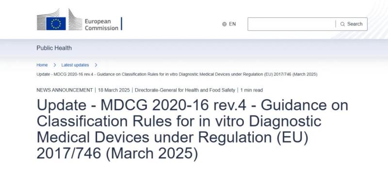 近日,歐盟MDCG小組發(fā)布最新指南MDCG 2020-16 Rev.4 -Guidance on Classification Rules for in vitro Diagnostic Medical Devices under Regulation (EU) 2017/746《IVDR法規(guī)下體外診斷醫(yī)療器械分類規(guī)則指南》 ,這是繼2024年7月該指南發(fā)布第三版后的再次更新,本次更新共有以下內容: