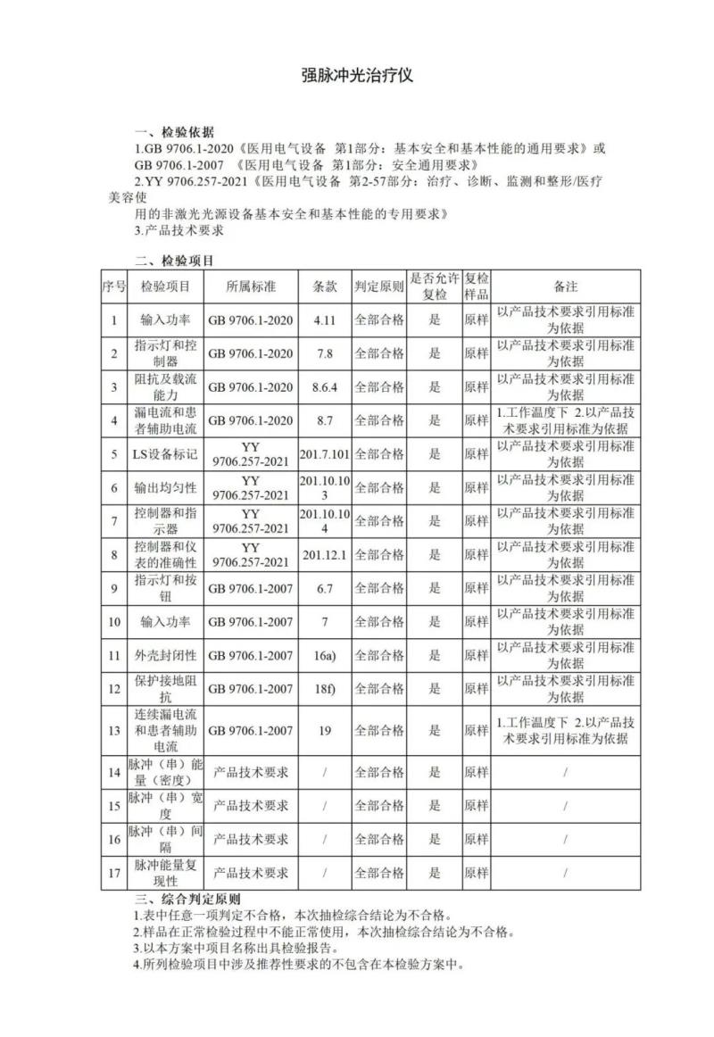 針對(duì)強(qiáng)脈沖光治療儀,國(guó)家藥監(jiān)局共提出了漏電流和患者輔助電流、LS設(shè)備標(biāo)記、輸出均勻性、脈沖(串)寬度、脈沖(串)間隔等17個(gè)檢驗(yàn)項(xiàng)目,同時(shí)指出,任意一項(xiàng)判定不合格,抽檢綜合結(jié)論即為不合格。具體如下: