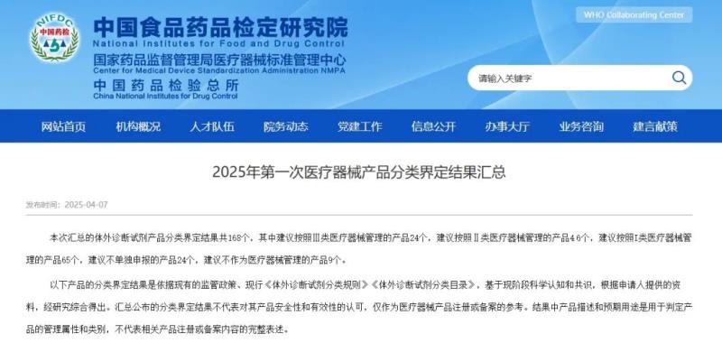 4月7日,國家藥監(jiān)局醫(yī)療器械標(biāo)準(zhǔn)管理中心發(fā)布《2025年第一次醫(yī)療器械產(chǎn)品分類界定結(jié)果匯總》,本次匯總的均為體外診斷試劑產(chǎn)品,共有168個,其中建議按照Ⅲ類醫(yī)療器械管理的產(chǎn)品24個,建議按照Ⅱ類醫(yī)療器械管理的產(chǎn)品46個,建議按照Ⅰ類醫(yī)療器械管理的產(chǎn)品65個,建議不單獨(dú)申報的產(chǎn)品24個,建議不作為醫(yī)療器械管理的產(chǎn)品9個。