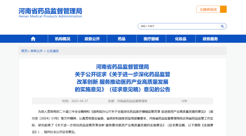 4月27日,河南省藥監(jiān)局發(fā)布《關(guān)于進一步深化藥品監(jiān)管改革創(chuàng)新 服務(wù)推動醫(yī)藥產(chǎn)業(yè)高質(zhì)量發(fā)展的實施意見(征求意見稿)》,以下簡稱《實施意見》),并向社會公開征求意見。