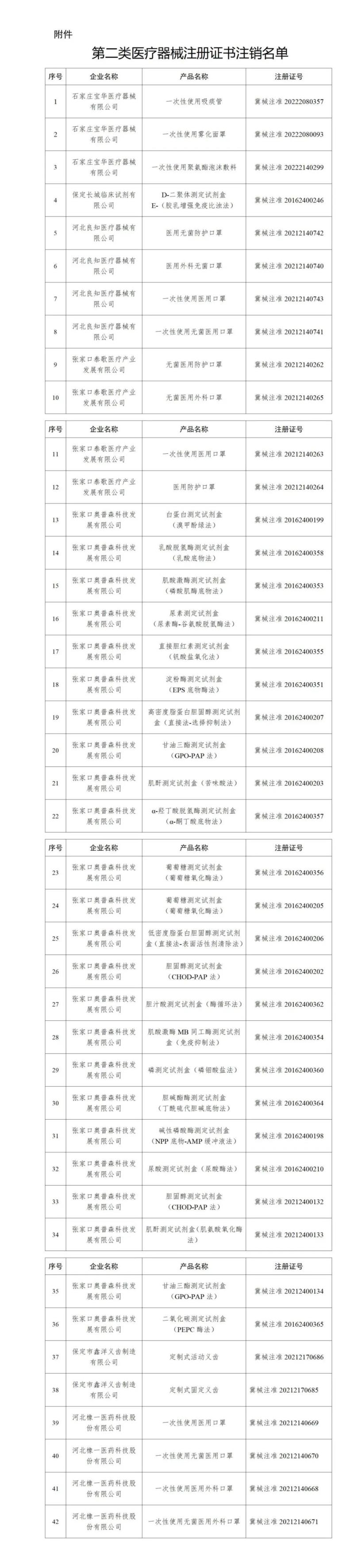 近日,河北省藥監(jiān)局發(fā)布公告稱(chēng),根據(jù)《中華人民共和國(guó)行政許可法》《醫(yī)療器械監(jiān)督管理?xiàng)l例》有關(guān)規(guī)定,依企業(yè)申請(qǐng),該局依法注銷(xiāo)了42個(gè)第二類(lèi)醫(yī)療器械注冊(cè)證書(shū),其中有12款產(chǎn)品為醫(yī)用口罩,還有一次性使用吸痰管、一次性使用霧化面罩、一次性使用聚氨酯泡沫敷料、定制式活動(dòng)義齒等,具體明細(xì)如下: