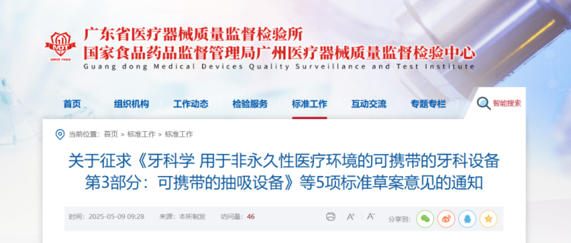 近日,廣東省醫(yī)療器械質(zhì)量監(jiān)督檢驗(yàn)所發(fā)布通知稱,根據(jù)《國(guó)家藥監(jiān)局綜合司關(guān)于印發(fā)2025年醫(yī)療器械行業(yè)標(biāo)準(zhǔn)制修訂計(jì)劃項(xiàng)目的通知》的要求,以及全國(guó)口腔材料和器械設(shè)備標(biāo)準(zhǔn)化技術(shù)委員會(huì)齒科設(shè)備與器械分技術(shù)委員會(huì)2025年的標(biāo)準(zhǔn)制修訂工作安排,齒科分技委組織相關(guān)起草單位完成了《牙科學(xué) 用于非永久性醫(yī)療環(huán)境的可攜帶的牙科設(shè)備 第3部分:可攜帶的抽吸設(shè)備》《牙科學(xué) 根管器械 第2部分:擴(kuò)大鉆》等5項(xiàng)標(biāo)準(zhǔn)草案征求意見稿,具體如下: