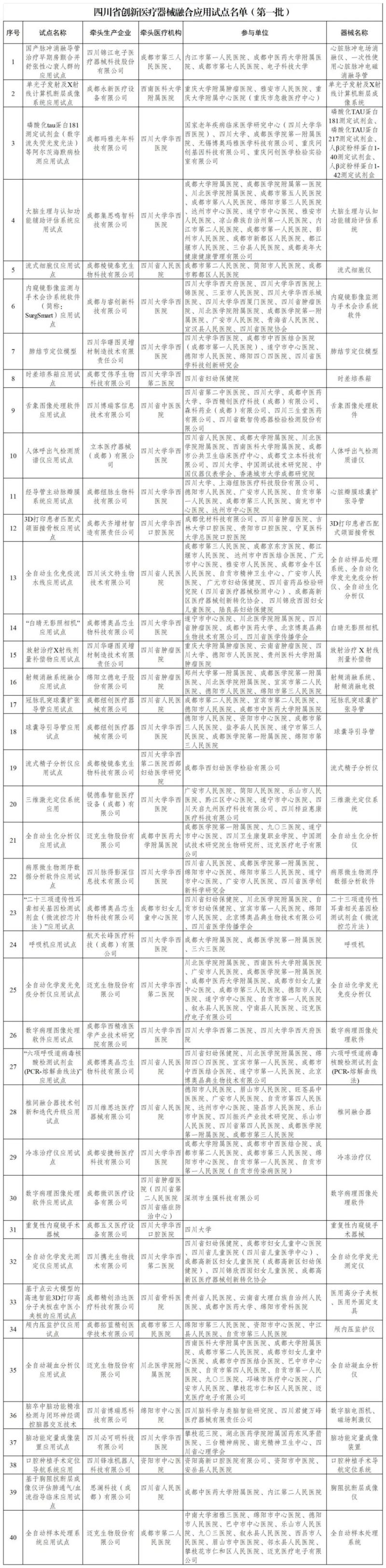 近日,四川省經(jīng)濟(jì)和信息化廳、四川省衛(wèi)生健康委員會等8部門聯(lián)合確定了《四川省創(chuàng)新醫(yī)療器械融合應(yīng)用試點名單(第一批)》并予以公布,包括大腦生理與認(rèn)知功能輔助評估系統(tǒng)、冷凍治療儀、醫(yī)用高分子夾板等器械產(chǎn)品,以下為具體明細(xì):