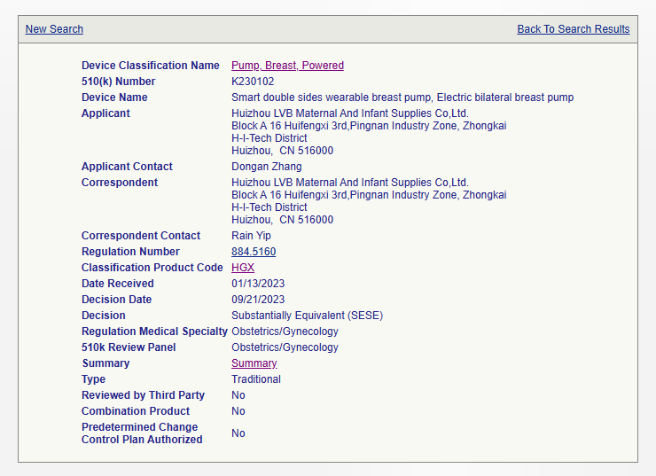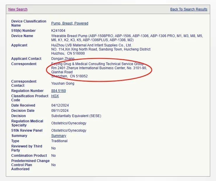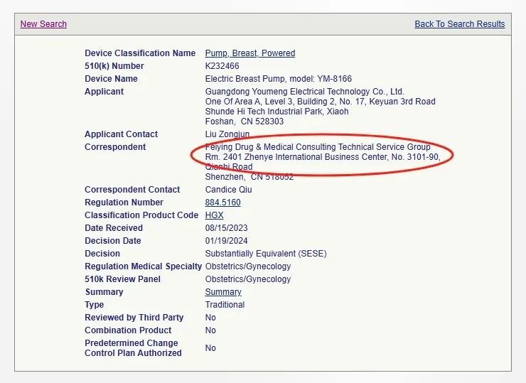 我們?cè)?/span>FDA 510(k)數(shù)據(jù)庫(kù)用產(chǎn)品代碼HGX進(jìn)行檢索,近兩年來由金飛鷹申報(bào)并作為官方Correspondent的有如下企業(yè)的吸奶器產(chǎn)品: