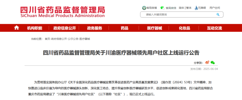 該社區(qū)平臺(tái)的開發(fā)上線是落實(shí)國(guó)務(wù)院辦公廳《關(guān)于全面深化藥品醫(yī)療器械監(jiān)管改革促進(jìn)醫(yī)藥產(chǎn)業(yè)高質(zhì)量發(fā)展意見》(國(guó)辦發(fā)〔2024〕53號(hào))文件精神的重要舉措。四川省藥監(jiān)局相關(guān)負(fù)責(zé)人表示,今后將持續(xù)拓展優(yōu)化社區(qū)平臺(tái)功能,逐步擴(kuò)大行業(yè)用戶覆蓋面,進(jìn)一步整合省內(nèi)臨床和醫(yī)療器械研發(fā)資源,為醫(yī)療器械創(chuàng)新研發(fā)提供全方位、全過程的服務(wù)支撐,助力臨床研究成果轉(zhuǎn)化,營(yíng)造良好醫(yī)療器械創(chuàng)新生態(tài)。