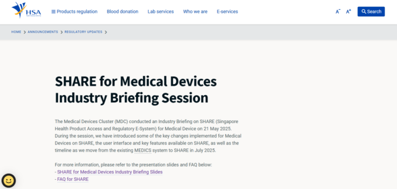 近日,新加坡HSA發(fā)布了有關醫(yī)療器械注冊提交新系統(tǒng)SHARE(Singapore Health Product Access and Regulatory E-System)的公告,介紹了SHARE與原有MEDICS系統(tǒng)相比的一些關鍵變化、SHARE上可用的用戶界面和主要功能,同時給出了有關SHARE逐步推進使用的關鍵時間線。