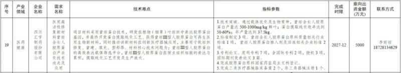 近日,四川省經(jīng)濟(jì)和信息化廳發(fā)布《關(guān)于開展2025年第三批企業(yè)找技術(shù)“雙向揭榜掛帥”項(xiàng)目申報(bào)工作的通知》(以下簡稱《通知》),對應(yīng)2025年第三批企業(yè)找技術(shù)“雙向揭榜掛帥”榜單的20家發(fā)榜企業(yè)的技術(shù)需求,公開征集解決方案。本次涉及人工智能、航空航天、高端能源設(shè)備、低空經(jīng)濟(jì)、新能源汽車及動(dòng)力電池、軟件和信息服務(wù)、醫(yī)藥健康、農(nóng)產(chǎn)品精深加工8個(gè)產(chǎn)業(yè)領(lǐng)域,其中有一個(gè)醫(yī)藥健康領(lǐng)域項(xiàng)目——“醫(yī)用高活性修復(fù)新材料重組全長人膠原蛋白產(chǎn)業(yè)化技術(shù)攻關(guān)及應(yīng)用”,具體明細(xì)如下:
