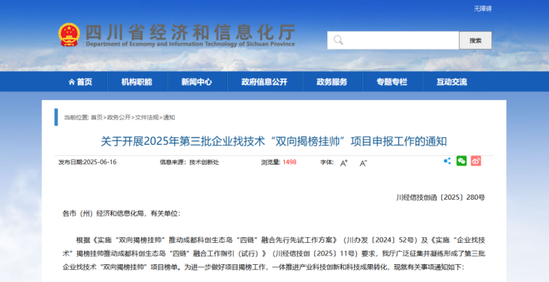 (二)系統(tǒng)填報(bào)。6月30日18:00前,揭榜方須登錄四川省經(jīng)濟(jì)和信息化廳官方網(wǎng)站“益企服務(wù)超市”中“企業(yè)找技術(shù)揭榜掛帥”工作專欄,填寫提交揭榜申報(bào)書、揭榜方案、必要證明材料等。未在工作專欄中提交揭榜申報(bào)書及逾期申報(bào)的不予受理。