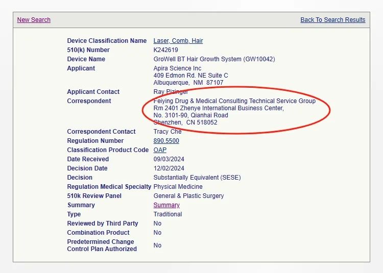 2024年9月,我們成功輔導(dǎo)美國(guó)企業(yè)Apira Science Inc獲批激光生發(fā)梳的510(k),在此之前,還有多家國(guó)內(nèi)企業(yè)獲批案例: