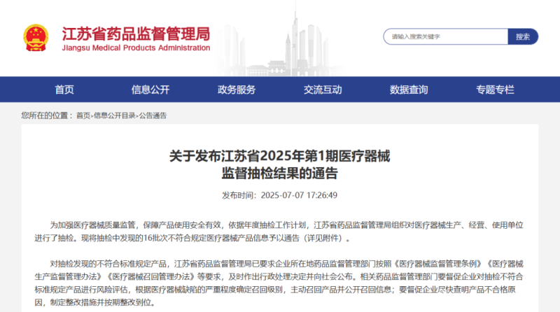 近日,江蘇省藥監(jiān)局發(fā)布《江蘇省2025年第1期醫(yī)療器械監(jiān)督抽檢結(jié)果的通告》,共通告了一次性使用直線切割吻合器及吻合組件、一次性使用鼻氧管、制氧機(jī)、聽(tīng)覺(jué)康復(fù)訓(xùn)練儀等16批次不符合規(guī)定醫(yī)療器械產(chǎn)品,具體明細(xì)如下:
