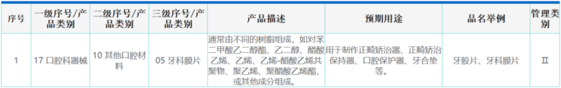 我們通過查看本次獲證產(chǎn)品的“結構及組成”可以看到,此類產(chǎn)品“由具有醫(yī)療器械注冊證的牙科膜片經(jīng)壓制成型后打磨、拋光而成?!币虼?,牙膠片/牙科膜片是正畸矯治器最為關鍵的一項原材料,可以外購,也可以企業(yè)自己生產(chǎn),但前提是要有注冊證(同樣是Ⅱ類產(chǎn)品,分類編碼17-10-05)。