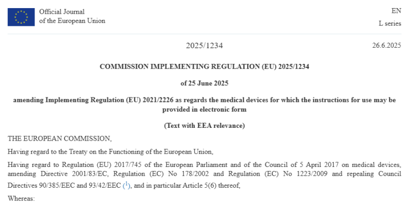 上月底,歐盟委員會發(fā)布COMMISSION IMPLEMENTING REGULATION (EU) 2025/1234,旨在對 2021 年出臺的醫(yī)療設(shè)備電子說明書相關(guān)條例Regulation(EU)2021/2226進行重要修訂,核心變化圍繞電子說明書的適用范圍與實施細節(jié)。