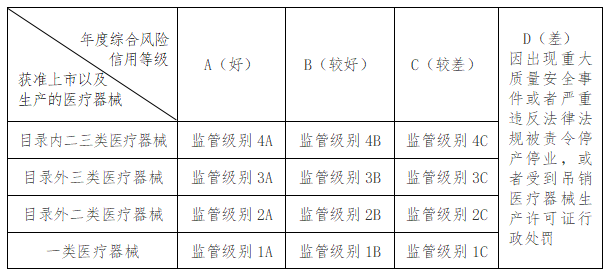 (四)因出現(xiàn)重大質(zhì)量安全事件或者嚴(yán)重違反法律法規(guī)被責(zé)令停產(chǎn)停業(yè),或者受到吊銷醫(yī)療器械生產(chǎn)許可證行政處罰的企業(yè)為D級(jí)企業(yè),表明其質(zhì)量管理體系運(yùn)行狀況及監(jiān)管信用記錄差。