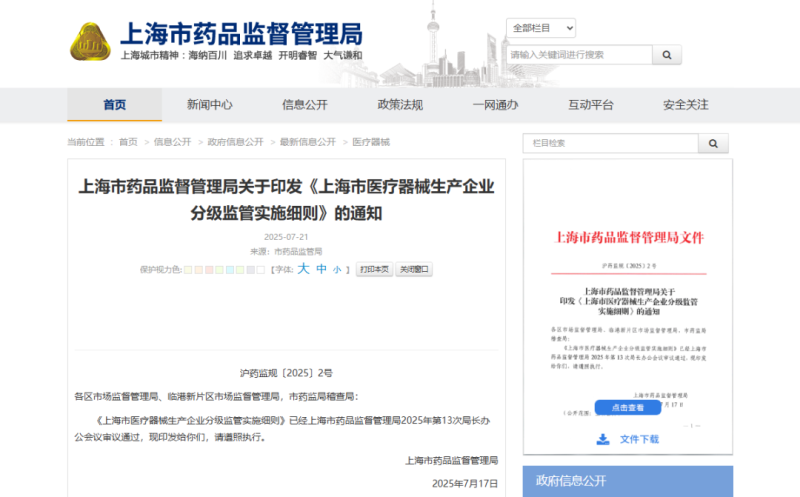 7月21日,上海市藥監(jiān)局發(fā)布《上海市醫(yī)療器械生產(chǎn)企業(yè)分級(jí)監(jiān)管實(shí)施細(xì)則》(以下簡稱《實(shí)施細(xì)則》),《實(shí)施細(xì)則》適用于對(duì)上海市醫(yī)療器械生產(chǎn)企業(yè)開展的日常監(jiān)督管理活動(dòng),所稱生產(chǎn)企業(yè)包括醫(yī)療器械注冊(cè)人、備案人以及受托生產(chǎn)企業(yè)。