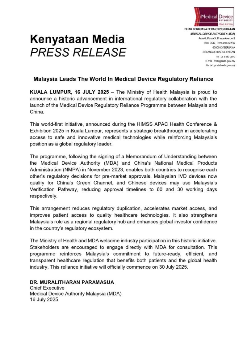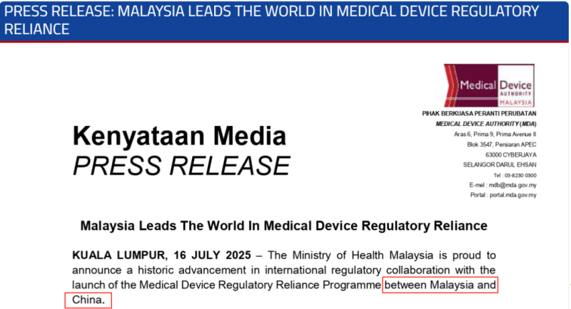 近日,馬來西亞MDA推出了馬來西亞與中國之間的醫(yī)療器械監(jiān)管互信計劃,該計劃提到,中國醫(yī)療器械產(chǎn)品憑NMPA認證可通過馬來西亞“驗證通道”(Verification Pathway)30個工作日極速獲批,而馬來西亞IVD產(chǎn)品也可經(jīng)中國“綠色通道”(Green Channel)60個工作日準入中國市場,計劃將于2025年7月30日正式啟動。
