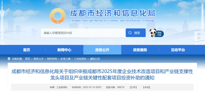 7月23日,成都市經(jīng)濟(jì)和信息化局發(fā)布《關(guān)于組織申報(bào)成都市2025年度企業(yè)技術(shù)改造項(xiàng)目和產(chǎn)業(yè)鏈支撐性龍頭項(xiàng)目及產(chǎn)業(yè)鏈關(guān)鍵性配套項(xiàng)目投資補(bǔ)助的通知》(以下簡稱《通知》),其中提到,對符合條件的企業(yè),給予最高1000萬元補(bǔ)助。《通知》具體內(nèi)容如下: