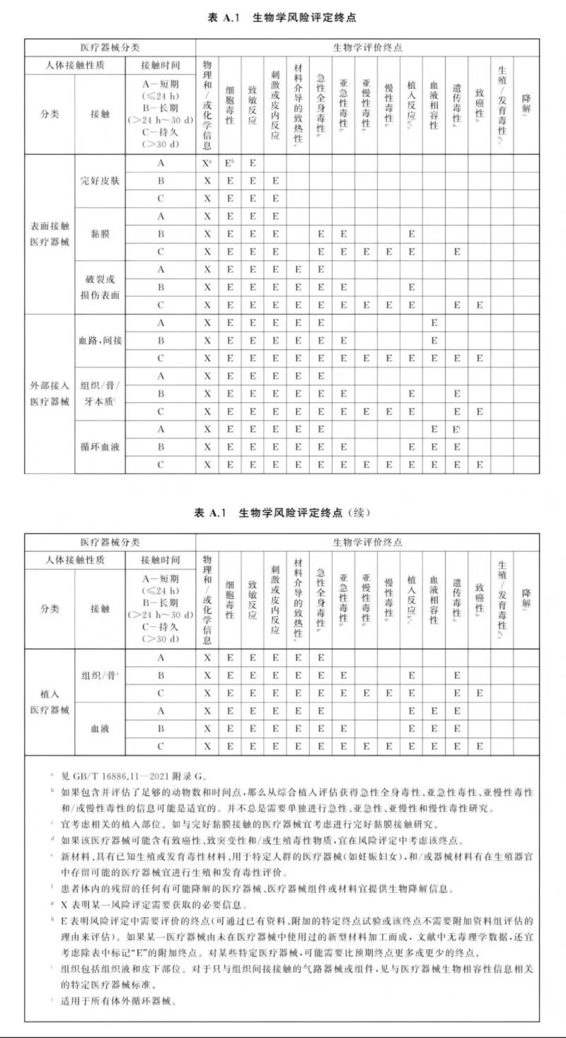 按照上述接觸性質和接觸時間2個分類原則確定了醫(yī)療器械類別之后,再根據標準GB/T 16886.1-2022的附錄A表A.1給醫(yī)療器械找出相對應的生物相容性檢驗項目。
