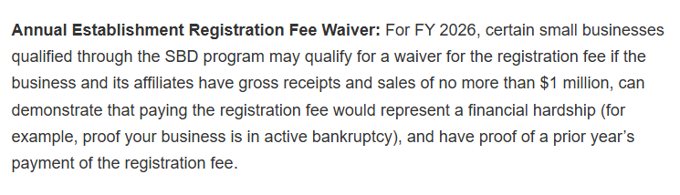 不過在費(fèi)用普漲的同時,F(xiàn)DA也釋放出了給企業(yè)減負(fù)的信號:2026財年,FDA給小企業(yè)提供了 免年費(fèi) 的選項(xiàng),前提是這些企業(yè)證明支付費(fèi)用會給他們帶來經(jīng)濟(jì)困難,具體條件如下: