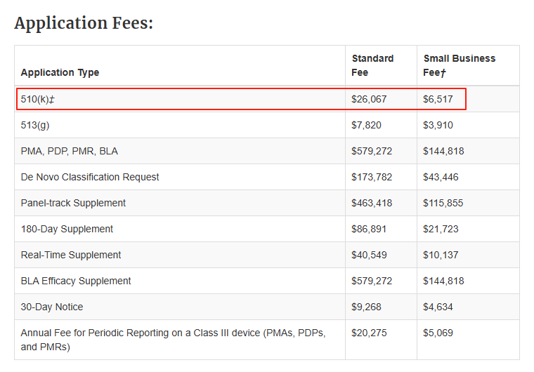 具體來說,企業(yè)注冊年費(fèi)漲至$11423,相比2025財年的$9280上漲了$2143,漲幅23.1%;相比而言,510(k)申請費(fèi)的漲幅則要稍小一些:其中510(k)申請標(biāo)準(zhǔn)收費(fèi)漲至$26067,小企業(yè)的510(k)申請費(fèi)則為6517美元,漲幅均為7.1%。