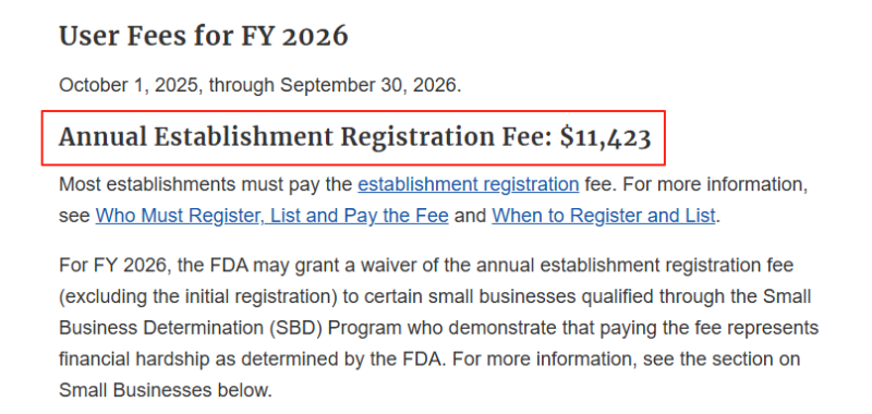 值得注意的是,2026財年的企業(yè)年費(fèi)的繳納期限為2025年10月1日-12月31日期間,也就是說,必須在2025年12月31日前完成支付。產(chǎn)品需出口美國的醫(yī)療器械企業(yè)一定要注意及時繳納年費(fèi),完成注冊更新工作,以確保下一年持續(xù)處于有效狀態(tài)。