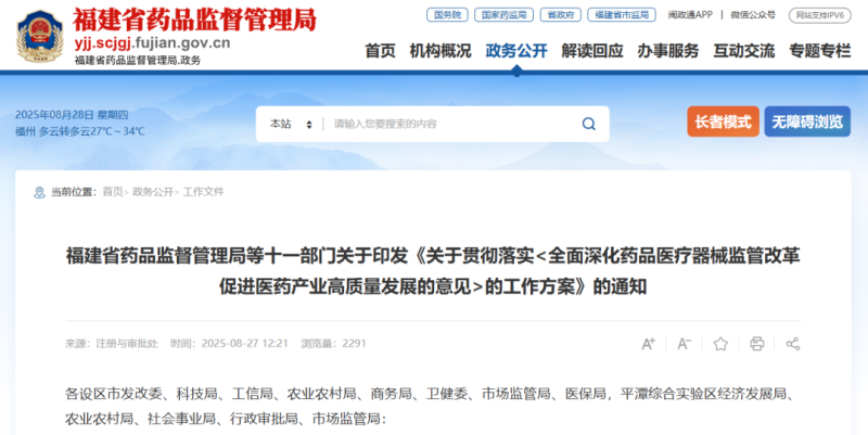 近日,福建省藥監(jiān)局發(fā)布《關(guān)于貫徹落實<全面深化藥品醫(yī)療器械監(jiān)管改革促進(jìn)醫(yī)藥產(chǎn)業(yè)高質(zhì)量發(fā)展的意見>的工作方案》(以下簡稱《工作方案》),從大力支持藥械研發(fā)創(chuàng)新、提高藥械審評審批質(zhì)效、提升醫(yī)藥產(chǎn)業(yè)全過程合規(guī)水平、擴(kuò)大醫(yī)藥產(chǎn)業(yè)對外開放合作、強(qiáng)化產(chǎn)業(yè)發(fā)展和監(jiān)管體系保障五個方面共提出了24條舉措,并提到,力爭到