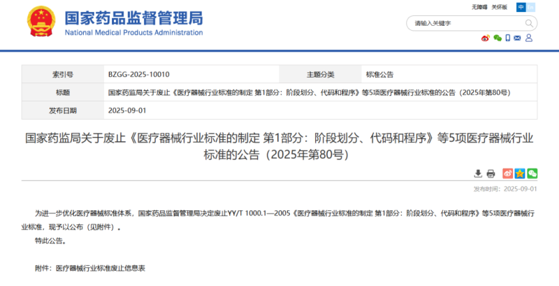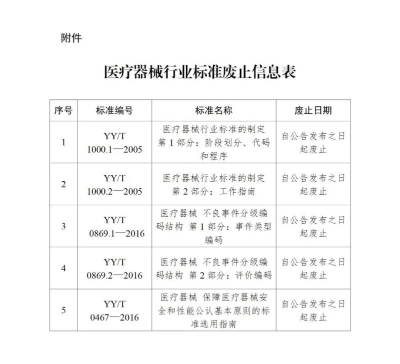 9月1日,國家藥監(jiān)局發(fā)布一則公告稱,該局決定廢止YY/T 1000.1-2005《醫(yī)療器械行業(yè)標(biāo)準(zhǔn)的制定 第1部分:階段劃分、代碼和程序》、YY/T 0869.1-2016《醫(yī)療器械 不良事件分級編碼結(jié)構(gòu) 第1部分:事件類型編碼》等5項醫(yī)療器械行業(yè)標(biāo)準(zhǔn),具體明細(xì)如下: